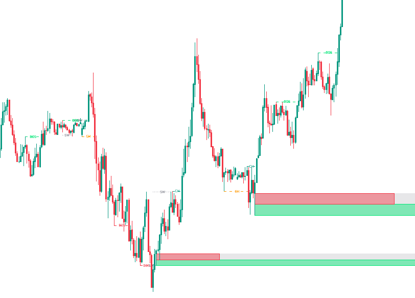 FVGとオーダーブロックを示す「BISI – SIBI (FVG) + Order Blocks + iFVG Impulsive Candles」