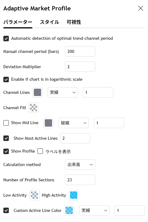 チャネルにもどついて斜めのマーケットプロファイルを表示する「Adaptive Market Profile – Auto Detect & Dynamic Activity Zones」