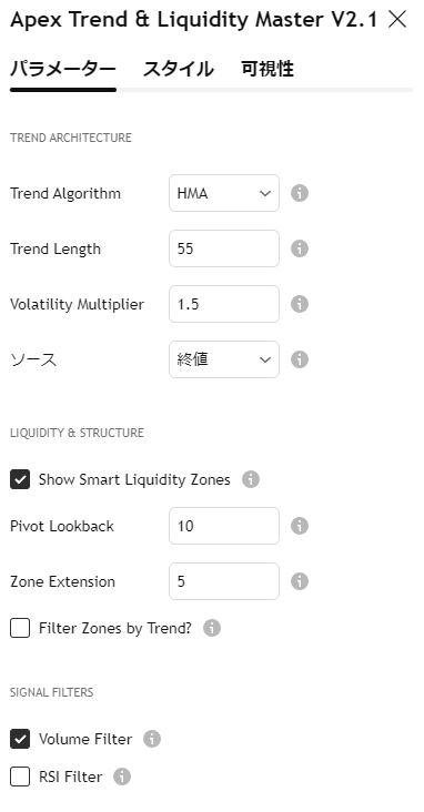 Smart Liquidityは、相場の高値と安値を検出して、サポレジゾーンを示します。これらは価格が突破するまでは表示されます。