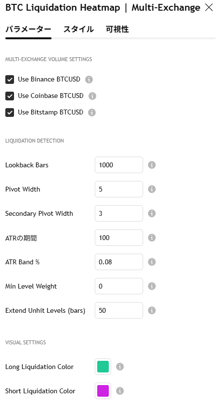 Binance、Coinbase、Bitstampの3か所の取引所を同時に集計して、どこにビットコインの本当のロスカット注文が溜まっているかを可視化するインジです。
