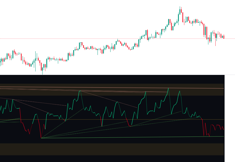 ダイバージェンスが生じた価格からラインを引く「RSI Momentum Divergence Zones [ChartPrime]」