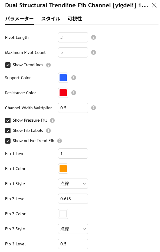 ピボット(高値安値)を使って自動でトレンドライン、チャネル、フィボナッチを描画するインジです。