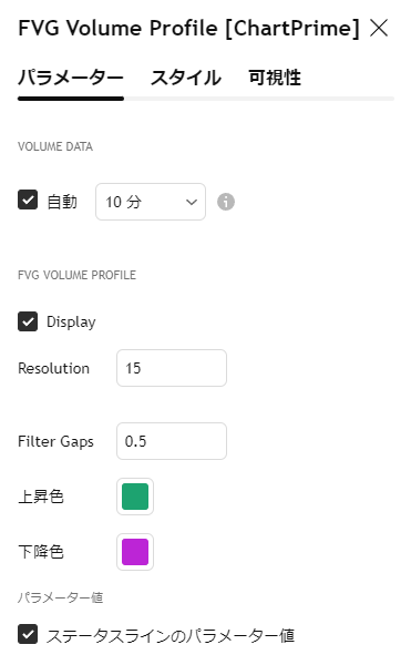 FVGの生じた価格帯のみに絞ってボリュームプロファイルを表示する面白いインジです。