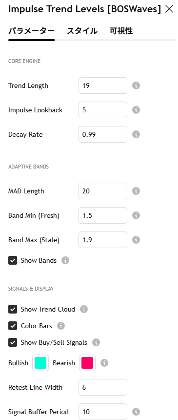 トレンドの勢いをバンド幅で示す「Impulse Trend Levels [BOSWaves]」