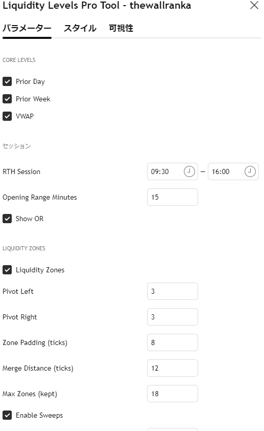 本インジで認識したliquidityゾーンは、接触回数、経過時間、前日・前週の高値安値などとのコンフルエンスから評価してスコアリングします。