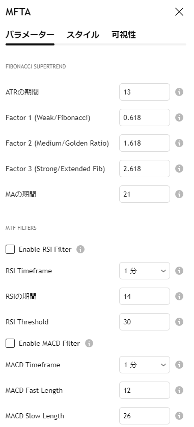 フィルタリング機能が付いており、下位足のRSI、MACDや出来高のフィルターでサインを出すこともできます。