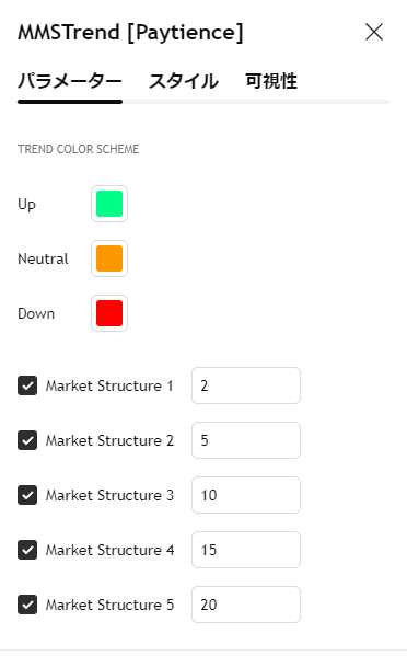 通常のマーケットストラクチャーは任意の1つの期間の高値や安値を基に判断されますが、このインジでは5つの期間を用いるため、より的確なトレンドの強さが判断できます。